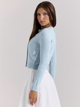 פרחים של נשים רקומה סרוג קרדיגן-ישן סגנון שרוול ארוך עם לחצן הכניסה, כחול בהיר