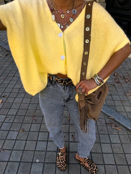 Lichtgewicht Breipak Met V-Hals Voor Dames-Super Relaxte Pasvorm, Korte Mouw, Vest Met Knopen En Grote Schouderdetails